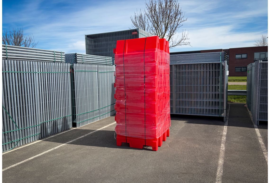 De 24 barriers worden compact gestapeld op pallets bij je afgeleverd. Omdat de transportkosten inclusief zijn, regelen wij het vervoer tot aan de poort. Zorg er wel voor dat je een heftruck ter plaatse hebt staan om de zware pallets veilig van de trailer te kunnen laden.
