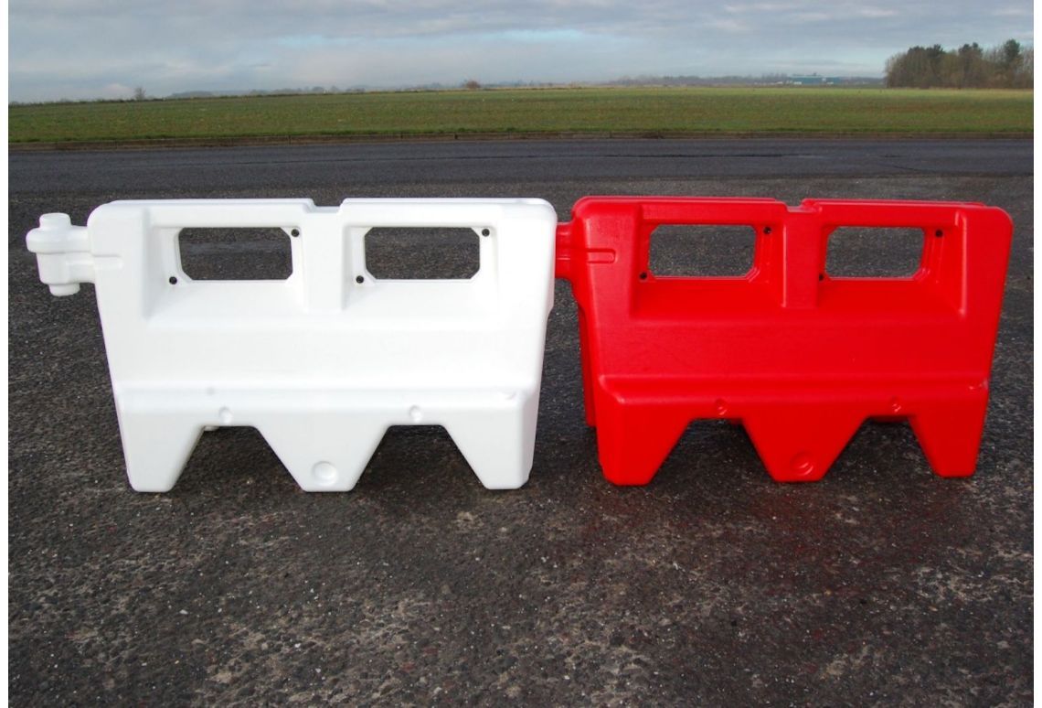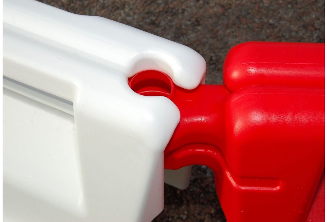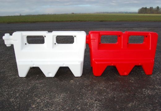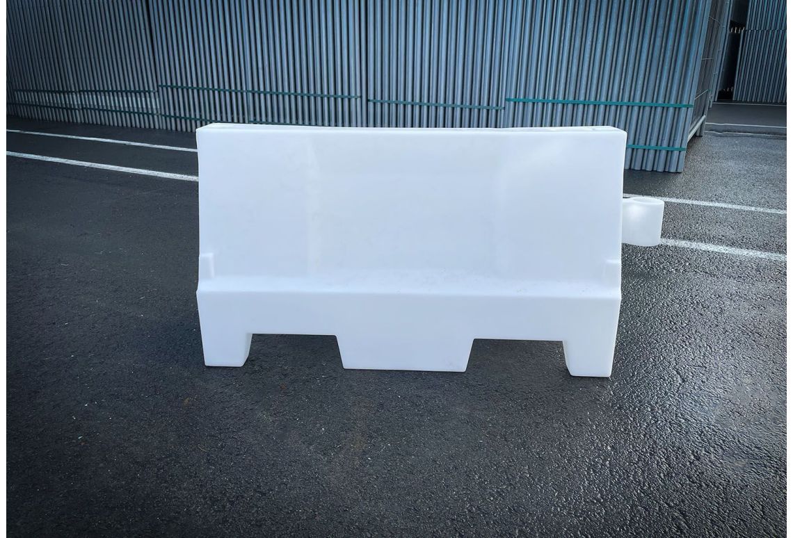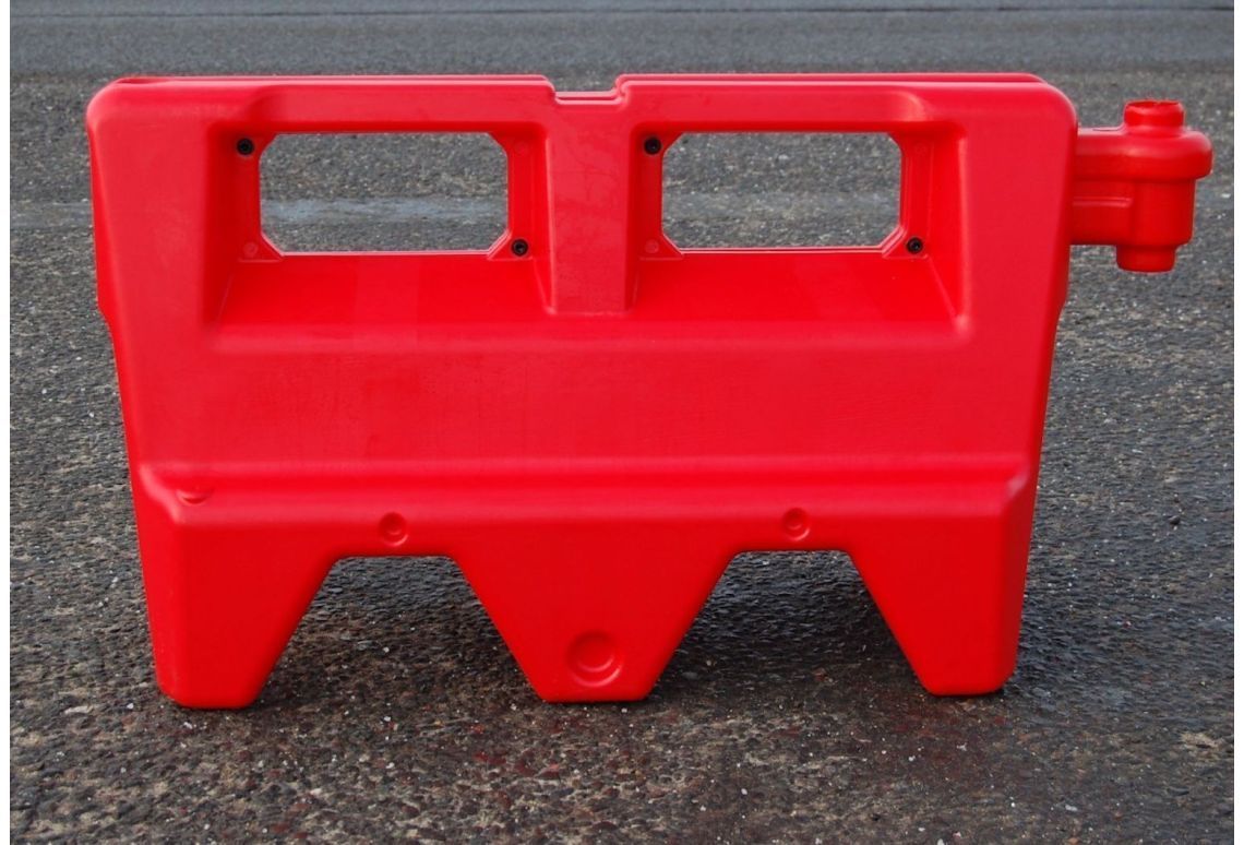 De barrier is gemaakt van hoogwaardig gerecycled kunststof. Als de barrier op zijn plaats staat kan die worden gevuld met water of zand voor stevigheid.