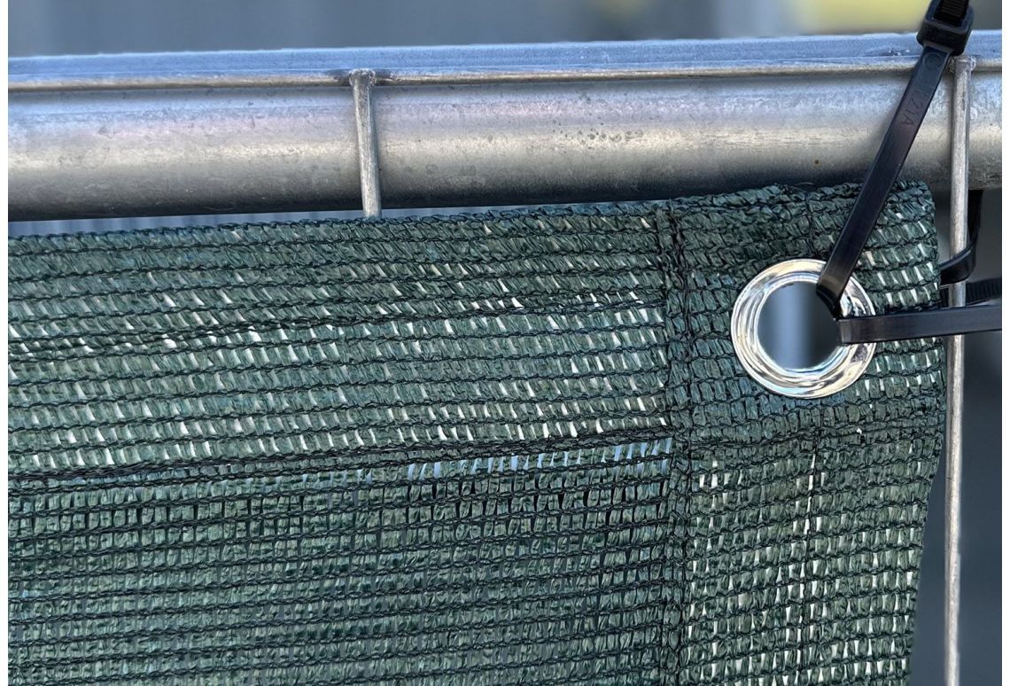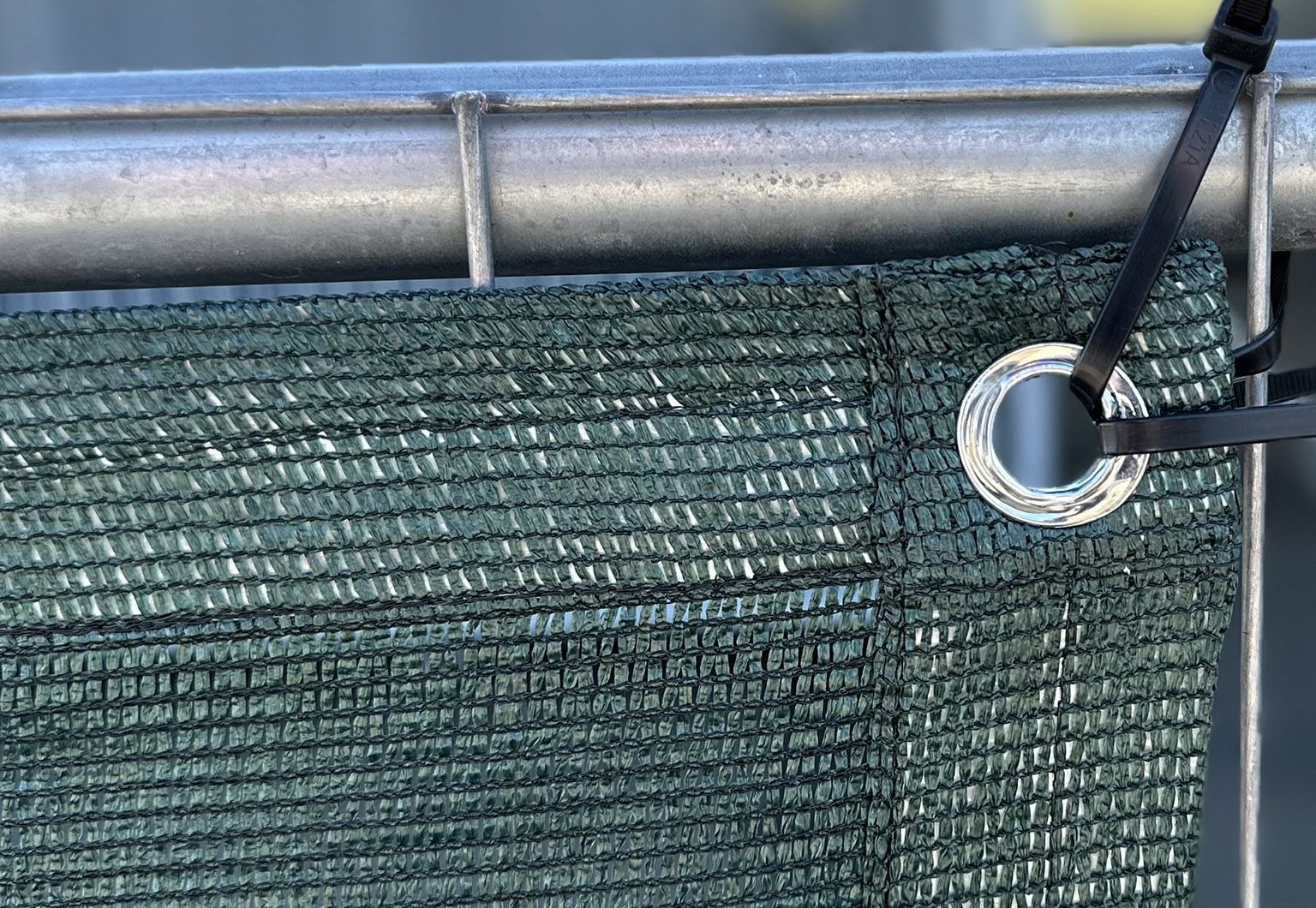 In het winddoek zitten ringen voor de bevestiging van het winddoek. Met behulp van tie wraps is een winddoek vast te maken aan een bouwhek.