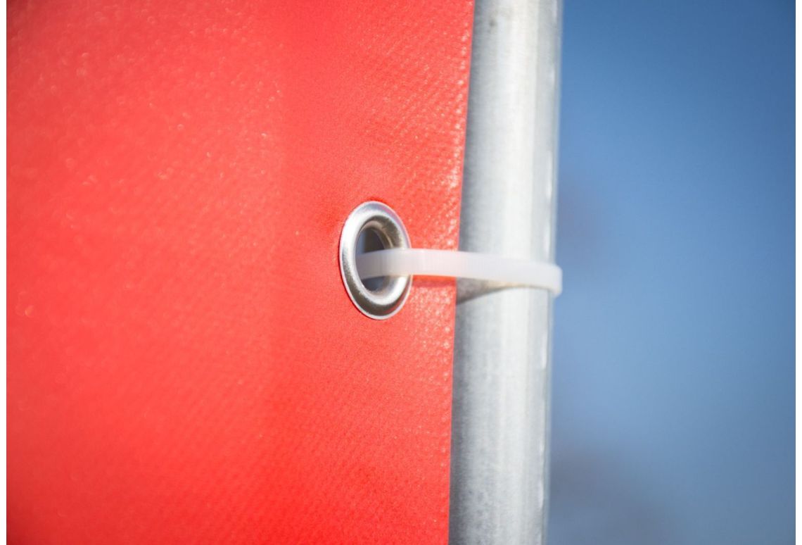 Montage: zet het bouwhekdoek in iedere hoek met twee tie-wraps vast - één om de horizontale buis en één om de verticale buis van het bouwhek. Zet het doek vervolgens om de 30 cm vast door een tie-wrap door elke ring te halen.