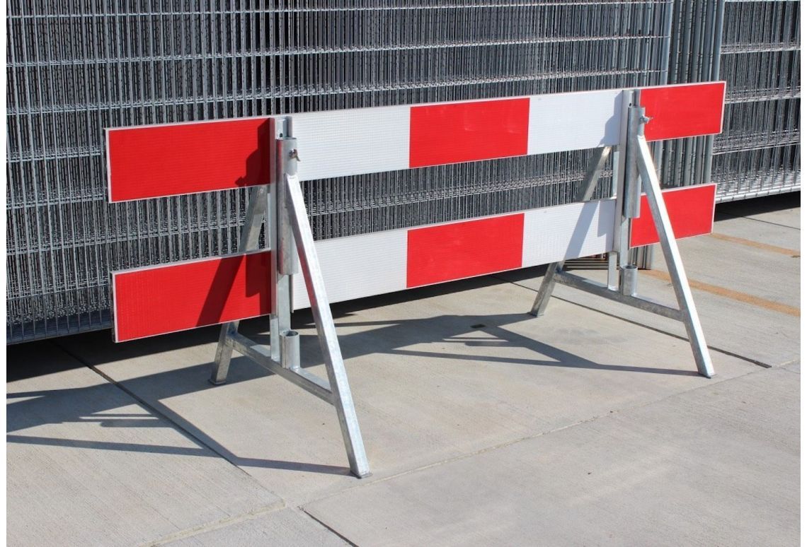 Aluminium schrikhek van 2,5 meter met twee planken met reflectie (eenzijdig) en een gegalvaniseerde A-standaard. De A-standaard heeft een U-profiel, inclusief twee buispaalhouders waar een verkeersbord in kan worden geplaatst.